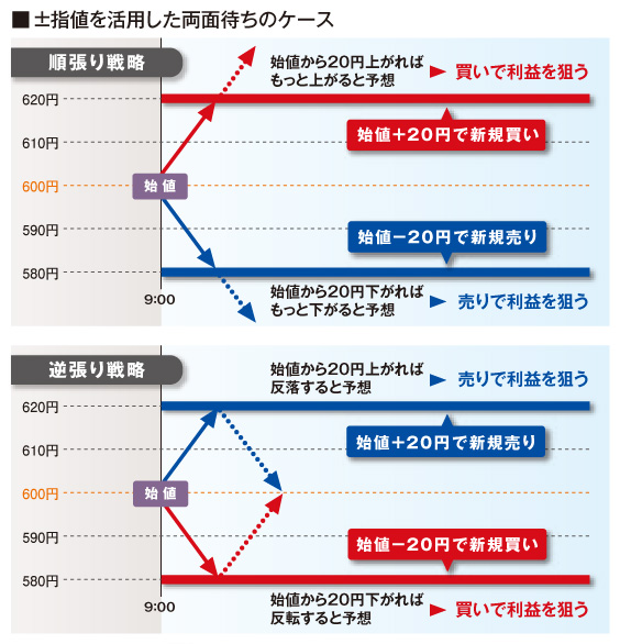 この±指値は、売りから入っても、買いから入っても利益を狙える 信用取引や先物・オプション取引での両面持ち「順張り」「逆張り」の戦略に適しています。たとえば、「始値プラス20円で新規買い」「始値マイナス20円で新規売り」の2つの注文を出せば、どちらかに動いたほうで利益を狙うことが可能。2つの注文を出しているので、この場合買えたら売り注文を取り消し、売れたら買い注文を取り消すのが基本です